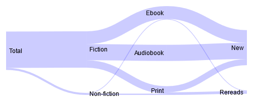 In last year’s reading retrospective post, I also predicted that I’d read more ebooks. Before we get to the good stuff (i.e. graphs), I want to point out again that if a book is listed under a particular month it doesn’t necessarily mean the book was both started and finished within that month. Most of the time, it just means that’s when I finished reading the book.
