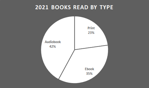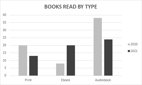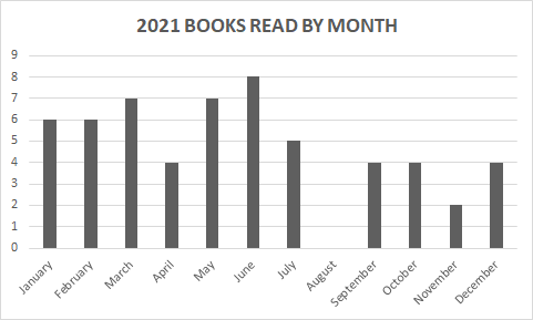 Last year I read 66 books. I didn’t manage to best that number in 2021, but I got pretty close: